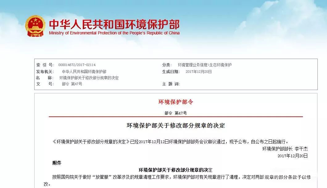 《环境保护部关于修改部分规章的决定》已经2017年12月12日环境保护部部务会议审议通过,现予公布,自公布之日起施行。